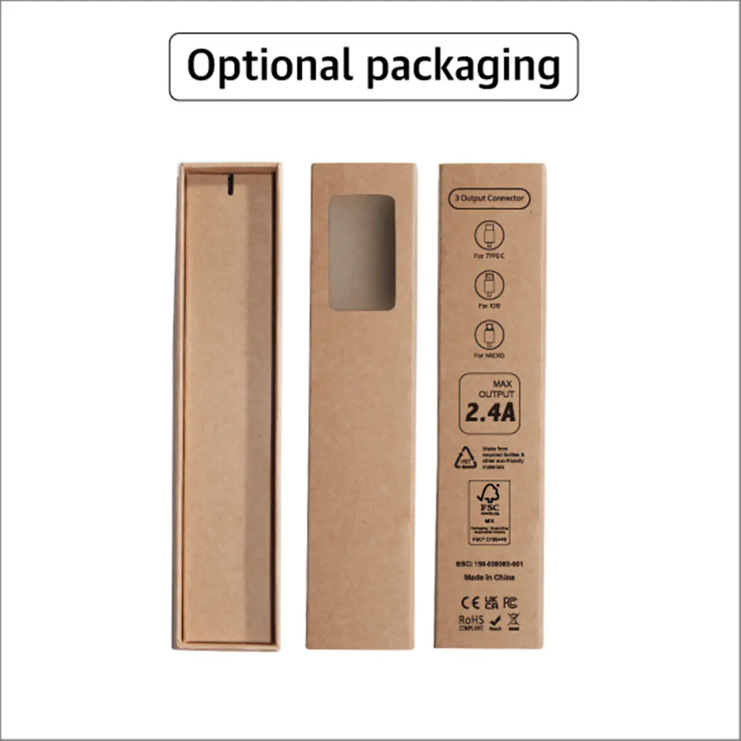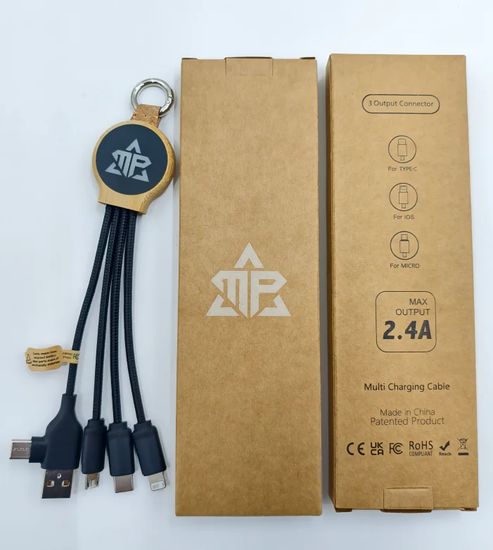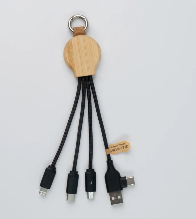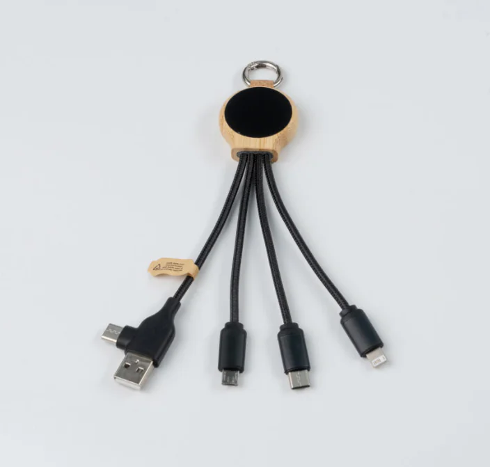 The SK1015B-F10 | 3-in-1 Bamboo LED Charging Cable (18W, 18.5cm) is where eco-conscious design meets functional tech. Crafted from recycled plastic (rPET) and encased in a natural bamboo shell, this cable delivers universal compatibility with USB-A and Type-C input connectors and Type-C, Micro USB, and 6-pin Lightning-style outputs—allowing users to charge up to three devices at once.